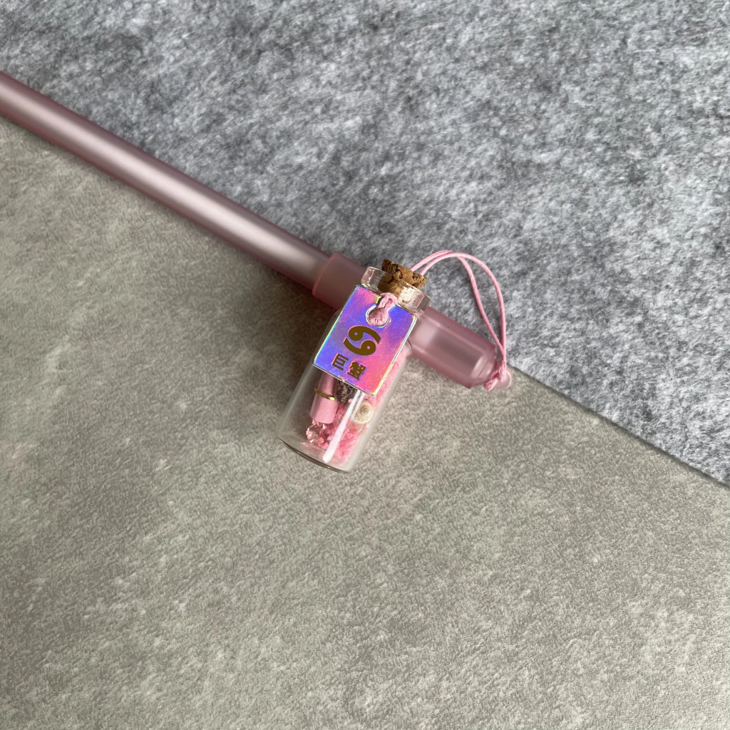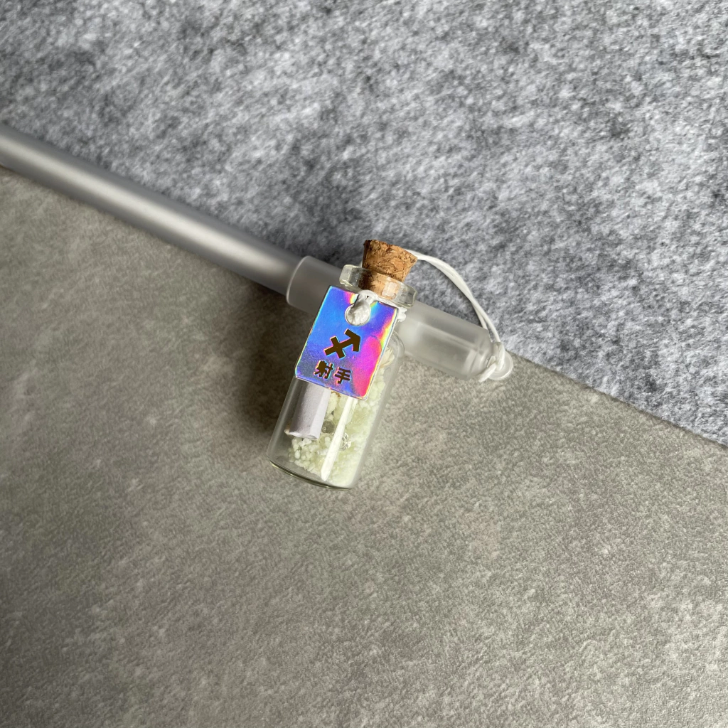 Uma caneta linda, que possui um frasquinho pendurado com uma cartinha do seu signo e dentro tem pedrinhas, conchas, flor, um pergaminho e areia luinosa.